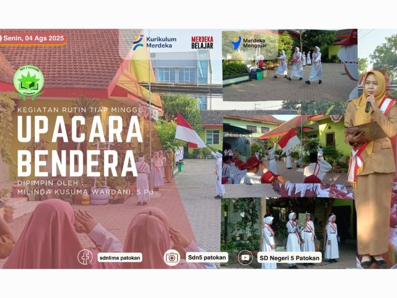 Pada hari Senin, 04 Agustus 2025 SD Negeri 5 Patokan mengadakan kegiatan rutin Upacara Bendera. Kegiatan ini merupakan salah satu cara untuk mencerminkan serta menanamkan rasa cinta tanah air pada bangsa dan negara Indonesia. Dengan melaksanakan upacara bendera di sekolah, kita turut mengenang dan menghargai jasa para pahlawan yang telah gugur membela negara Indonesia. salah satu tujuan upacara bendera ialah menanamkan rasa patriotisme dalam diri generasi muda bangsa. Sebab, nasionalisme harus dilestarikan selama suatu negara itu ada. Dengan demikian, upacara bendera menjadi salah satu cara untuk membentuk karakter bangsa. Upacara Bendera diikuti oleh seluruh siswa mulai dari kelas 1 sampai kelas 6.