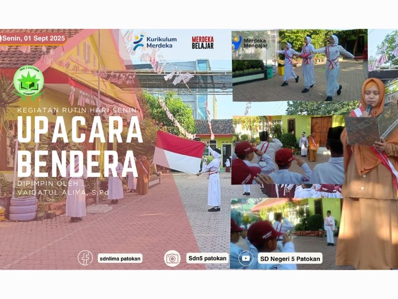 Pada hari Senin, 01 September 2025 SD Negeri 5 Patokan melaksanakan Upacara Bendera yang rutin dilakukan setiap hari senin. Upacara bendera merupakan salah satu upaya dalam menumbuhkan budi pekerti dan karakter bangsa kepada para siswa, terutama nilai-nilai kebangsaan dan kebhinekaan. Upacara Bendera minggu ini dipimpin oleh ibu Vaidatul Aliya, S.Pd. dalam kegiatan upacara ini, ibu Aliya mengingatkan siswa agar mengikuti upacara dengan khitmat dan penuh rasa tanggung jawab.