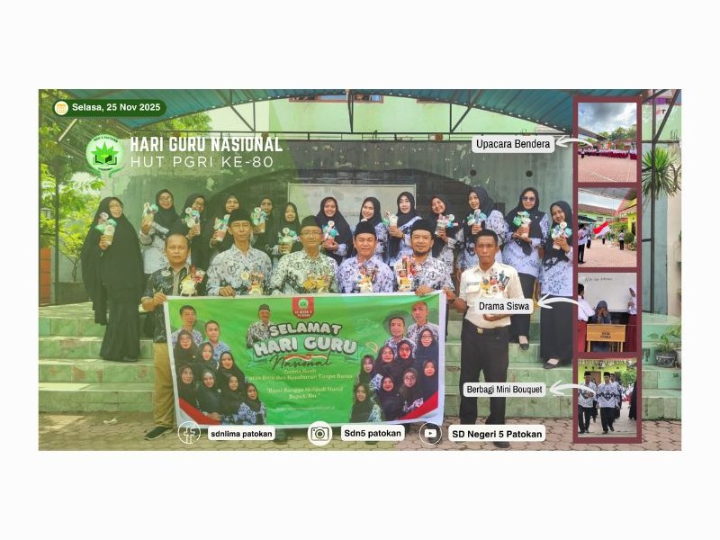 Pada hari Selasa, 25 November 2025 SD Negeri 5 Patokan melaksanakan kegiatan Upacara Bendera dalam rangka memperingati Hari Guru Nasional Dan HUT RI ke-80 di halaman Sekolah SD Negeri 5 Patokan. Dalam Upacara Bendera tersebut Guru SD Negeri 5 Patokan menjadi Petugas Upacara Bendera. Kegiatan tersebut berlajan dengan khitmat dan tertib. Tidak lupa pula setelah Upacara selesai, Dewan Guru menyanyikan Mars PGRI Bersama-sama yang dipimpin oleh Bu Helda Puspitasari, S.Pd. Kemudian kegiatan dilanjutkan dengan Pertunjukan Drama oleh kelas 6 yang mengangkat tentang tema Guru. Dilanjutkan pembacaan Puisi dan Menyanyikan lagu Terima Kasih Guruku oleh Ananda Nadine, Almeera dan juga Diva. Kemudian Kegiatan Hari Guru Nasional ditutup dengan berbagi Mini Hampers dengan Masyarakat sekitar sekolah.