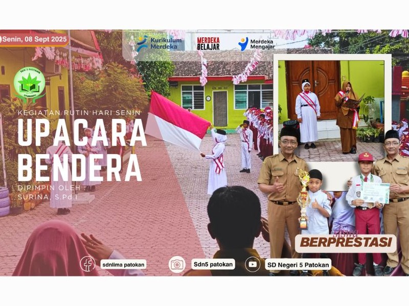 Pada hari Senin, 08 September 2025 SD Negeri 5 Patokan mengadakan kegiatan rutin Upacara Bendera. Kegiatan ini merupakan salah satu cara untuk mencerminkan serta menanamkan rasa cinta tanah air pada bangsa dan negara Indonesia. Dengan melaksanakan upacara bendera di sekolah, kita turut mengenang dan menghargai jasa para pahlawan yang telah gugur membela negara Indonesia. salah satu tujuan upacara bendera ialah menanamkan rasa patriotisme dalam diri generasi muda bangsa. Sebab, nasionalisme harus dilestarikan selama suatu negara itu ada. Dengan demikian, upacara bendera menjadi salah satu cara untuk membentuk karakter bangsa. Upacara Bendera diikuti oleh seluruh siswa mulai dari kelas 1 sampai kelas 6.