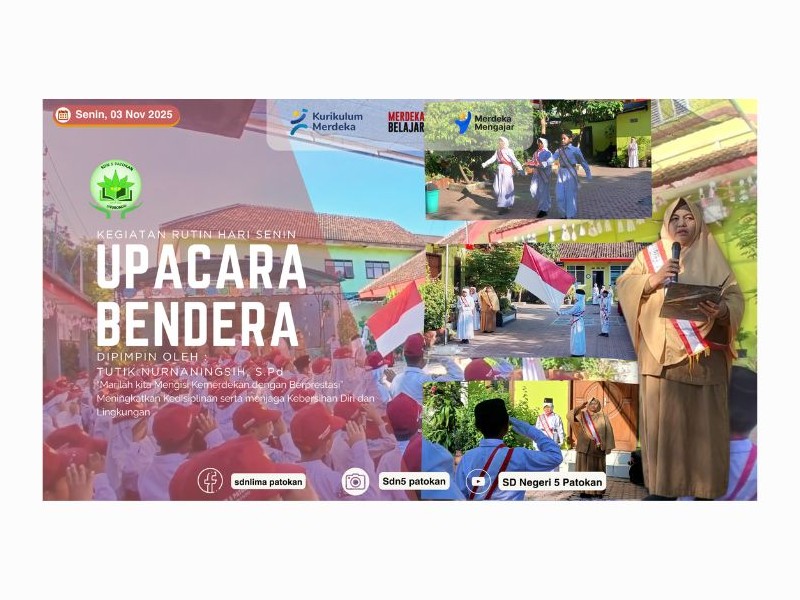 Pada hari Senin, 03 November 2025 SD Negeri 5 Patokan mengadakan kegiatan rutin Upacara Bendera. Kegiatan ini merupakan salah satu cara untuk mencerminkan serta menanamkan rasa cinta tanah air pada bangsa dan negara Indonesia. Dengan melaksanakan upacara bendera di sekolah, kita turut mengenang dan menghargai jasa para pahlawan yang telah gugur membela negara Indonesia. Salah satu tujuan upacara bendera ialah menanamkan rasa patriotisme dalam diri generasi muda bangsa. Sebab, nasionalisme harus dilestarikan selama suatu negara itu ada. Dengan demikian, upacara bendera menjadi salah satu cara untuk membentuk karakter bangsa. Upacara Bendera diikuti oleh seluruh siswa mulai dari kelas 1 sampai kelas 6. Pada Upacara Bendera kali ini, Bu Tutik Nurnaningsih, S.Pd sebagai Pembina Upacara mengingatkan siswa agar meningkatkan rasa Disiplin baik dalam hal berpakaian maupun ketika datang ke Sekolah. Tidak lupa juga mengingatkan siswa untuk menjaga kebersihan Diri maupun Lingkungan, khususnya di Lingkungan Sekolah.